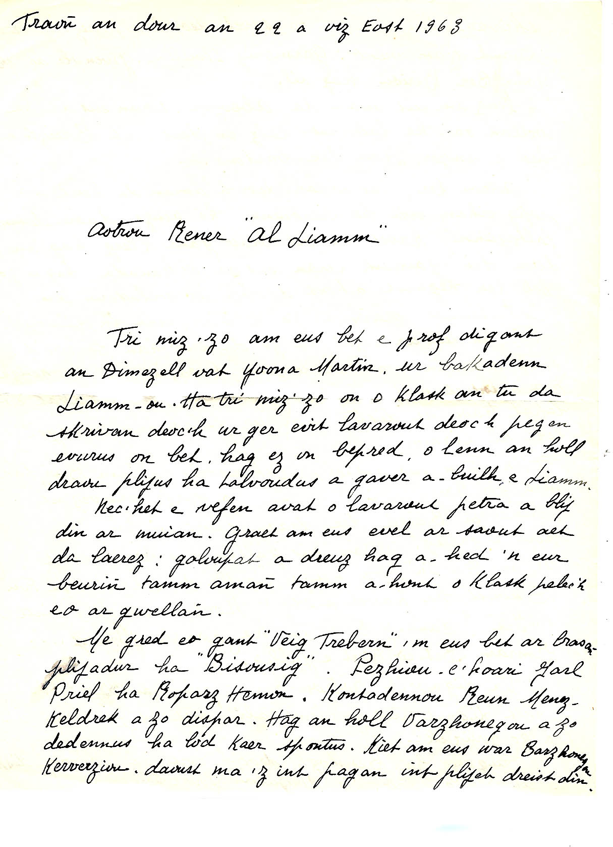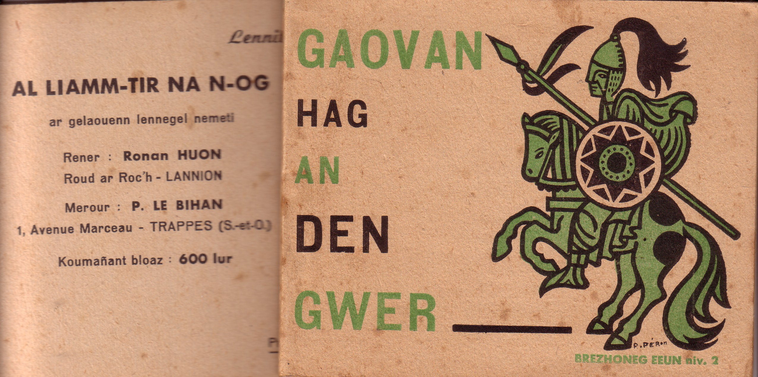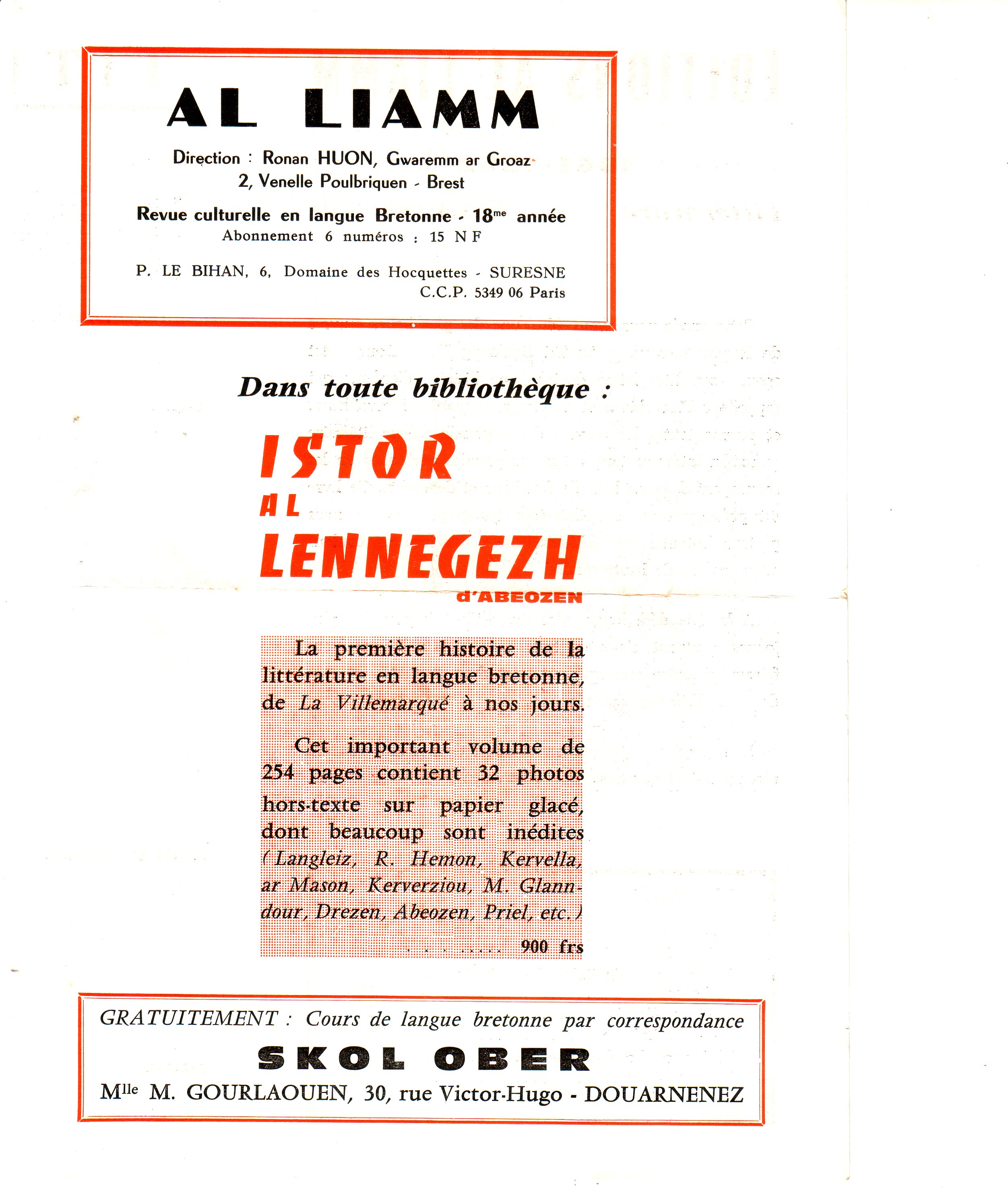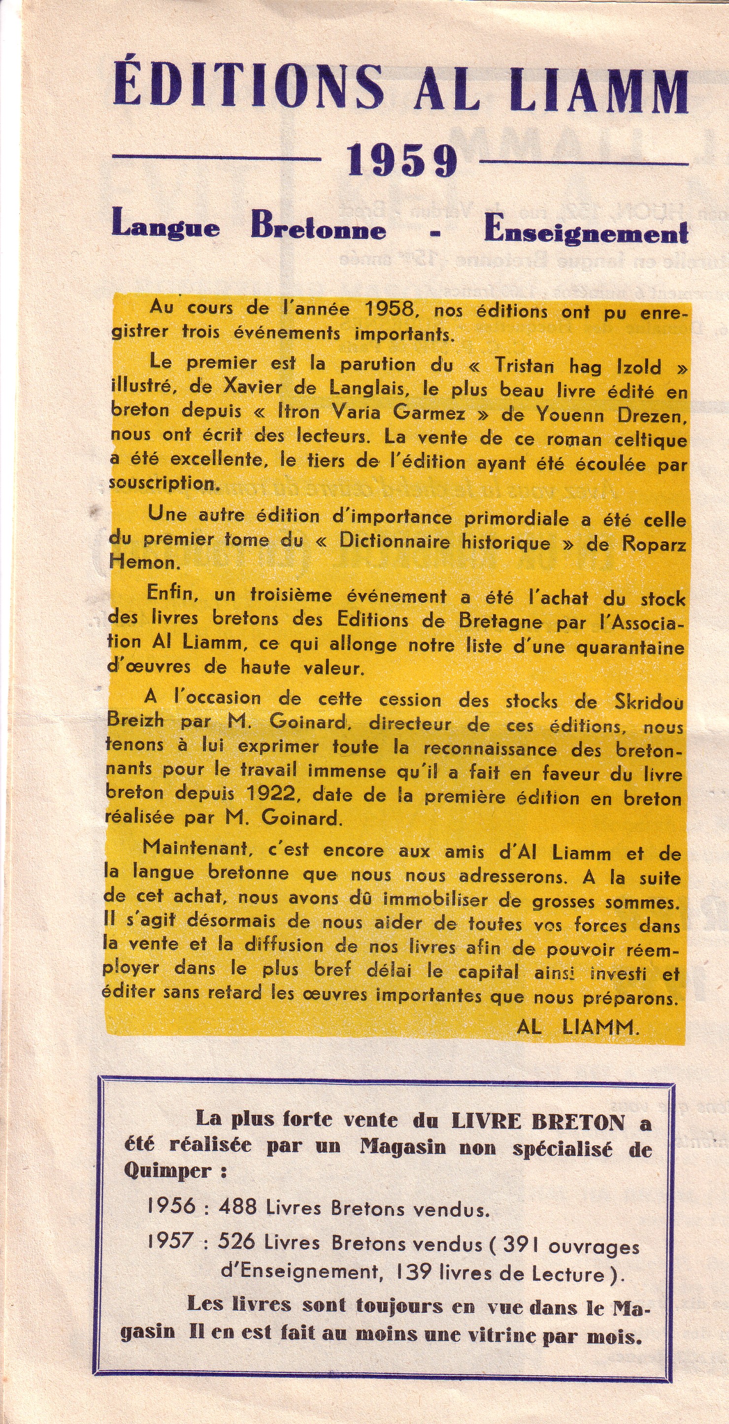« Ret eo deomp embann levrioù brezhonek. Ar muiañ ar gwellañ. N’eus nemet an doare-se da saveteiñ un nebeut eus an dud a ya bemdez diouzh tu ar galleg. Setu perak hon eus savet hon embannadurioù nevez. (Al Liamm Ronan Huon niv 20 miz mae-mezheven 1950)