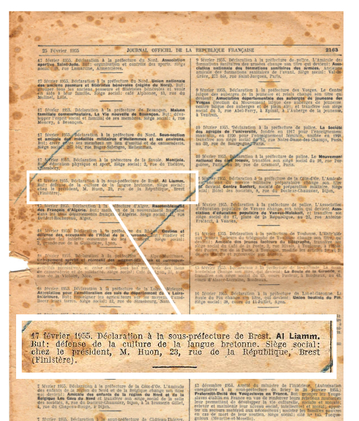 Al Liamm: un ti-embann da vatEr bloavezh 1955 e voe diskleriet ez ofisiel ar gevredigezh AL Liamm e is-prefedi Brest. » o vezañ ma ne glote ket mui diskleriadurioù kozh Tir na nOg pe Al Liamm gant ar pezh eo deut ar gelaouenn da vezañ hon eus graet un diskleriadur nevez. Ar gevredigezh a zo bet diskleriet e Brest d’ar 17 a viz C’hwvrer 1955. Dindan renerezh Ronan Huon emañ Embannet eo bet war niverenn 49 kelaouenn ar Republik d’ar 25 a viz C’hwevrer 1955. Pal ar gevredigezh a zo difenn sevenadur, lennegezh ha yezh Breizh. »(Al niv 5O miz mae mezheven 1955). “
